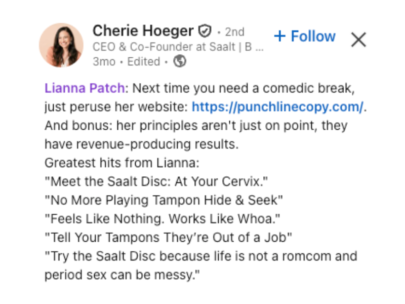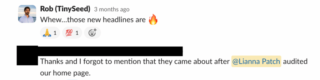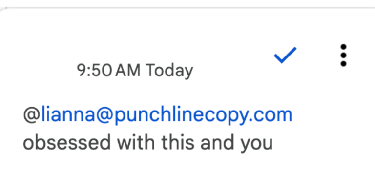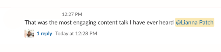Yeah, Lianna was engaging and well-prepared and knows her shit, but isn’t that kinda table stakes? Beyond the entertainment factor and the warm feeling of “investing in learning as a team,” she gave us easy frameworks to practice and lots of examples using our own existing copy and ads. Honest, practical stuff we can use. Exactly zero members of my team are going to be pursuing a new career in comedy, but now every single one of them has the confidence that they can sound like a human while still representing our brand.”