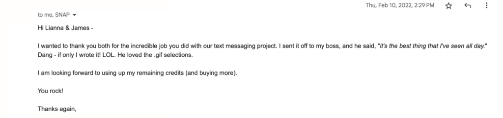 Thank you so much. Your work kicks ass, and you’re a pleasure to work with. Now is when you ask for referrals and we gladly recommend you. Business needs more human. You bring human. Thanks for giving SSS more voice!”
