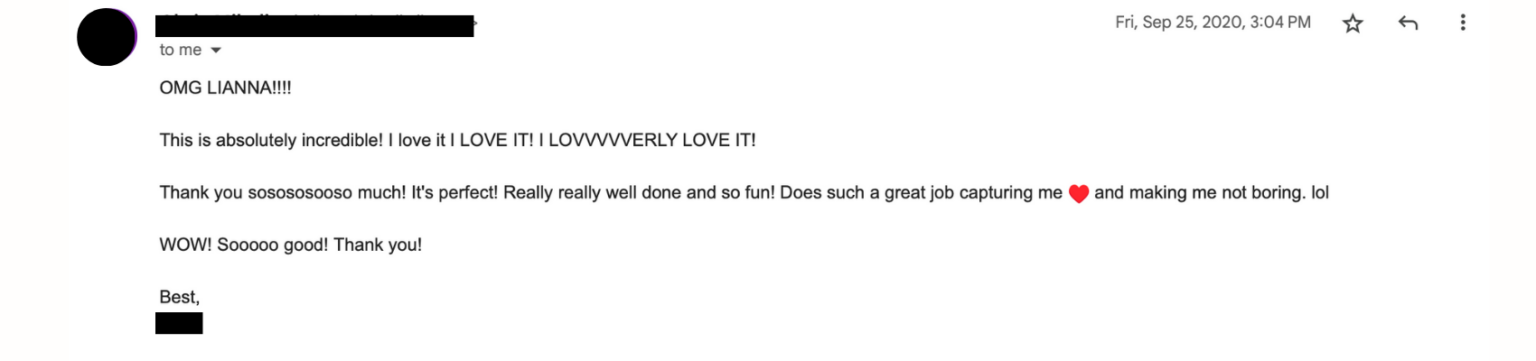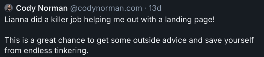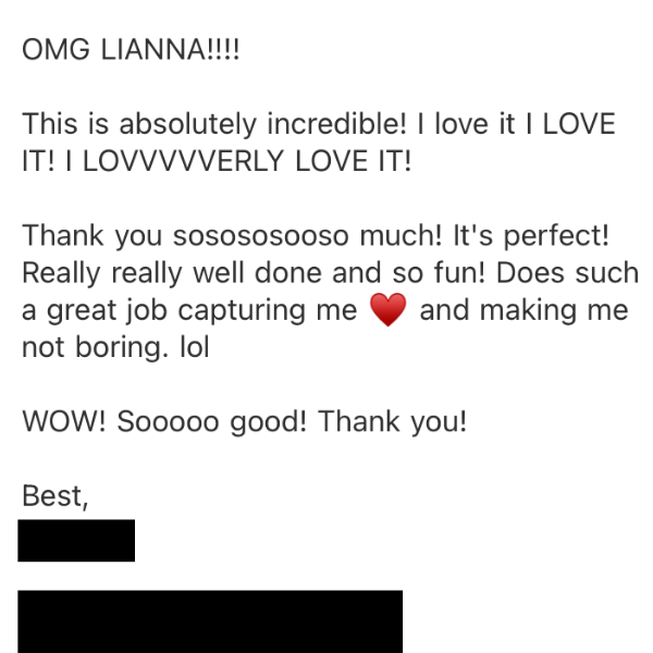 As with everything Lianna does, I’d give this a 10/10. She made me a 20-min video full of funny, little gold nuggets that I can sprinkle onto my homepage. My homepage will (finally!) develop that cool girl personality I’ve always wanted — huge win. Thank you, Lianna. And you! I can feel you thinking about this offer — I’m telling you don’t have to think anymore. Just click over to checkout, pull out your credit card & desperately hope she still has spots available (like I did!)