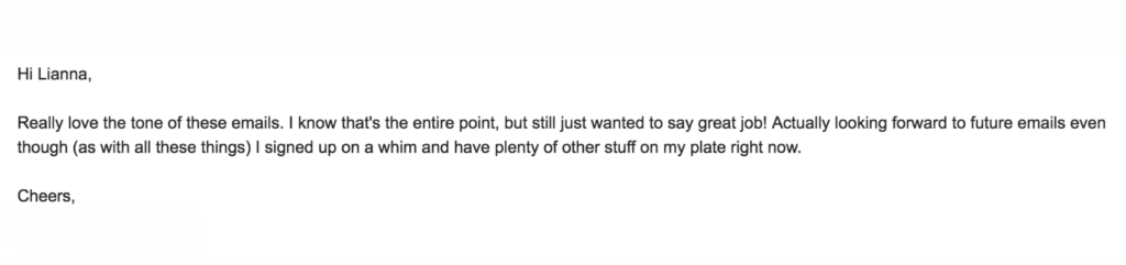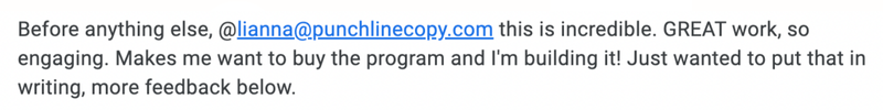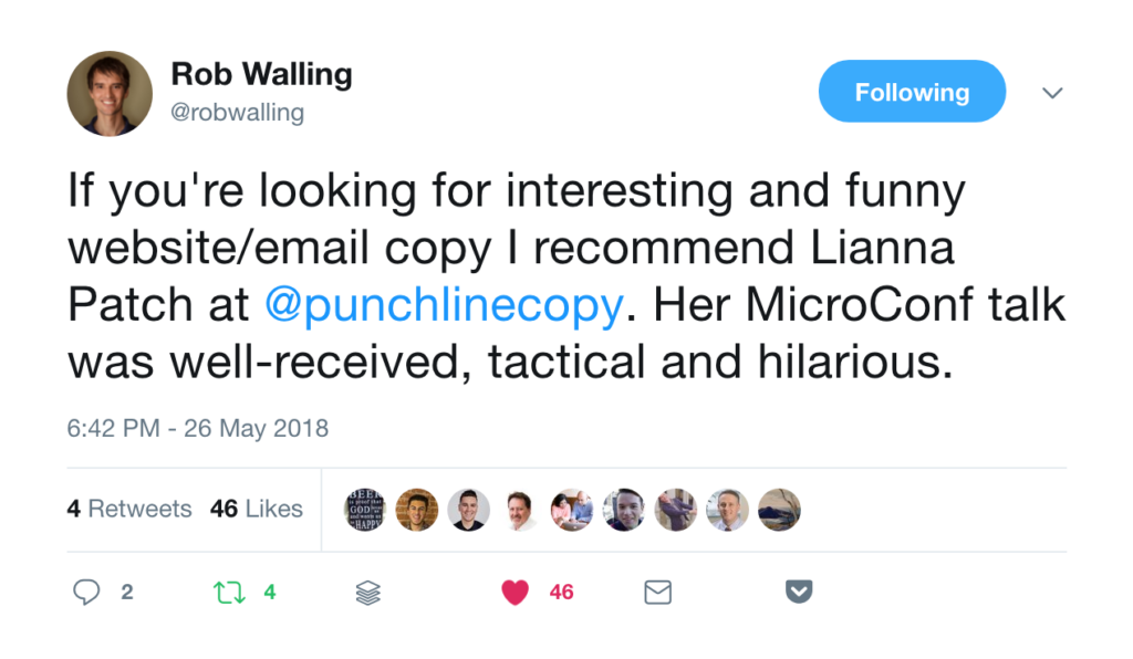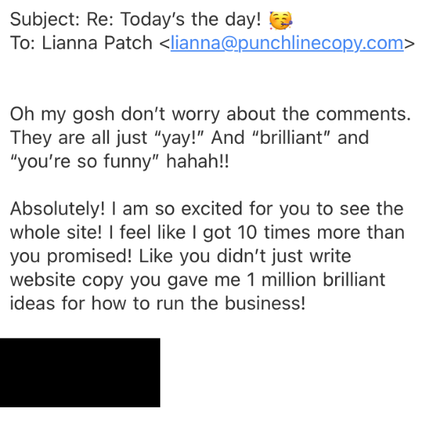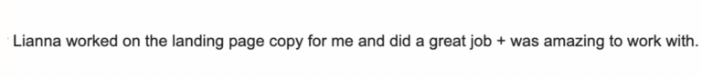 Lianna is good. Really good. We were redoing a sales page that was pretty old and really needed an overhaul, and purchased Lianna’s ‘Uppercut’ where she rewrites the page for you. It is SO MUCH BETTER than it was before. If you want your copy to be serious or straightforward (read: boring) Lianna probably isn’t the best fit. Otherwise she’s awesome and I highly recommend her.”