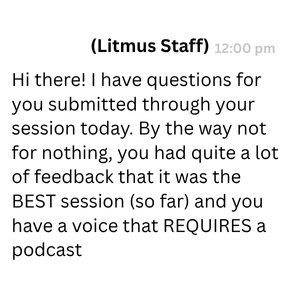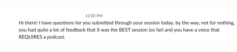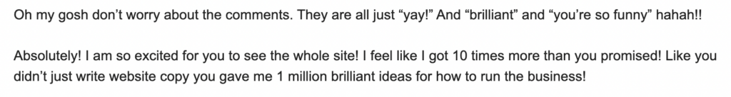 “Oh my goodness… so, I feel like a big weight has been lifted off me. I do realize i have a lot of work, but now I have an outline of what that’s supposed to look like. Thank you thank you thank you. When this is completed and I’m a millionaire, I will definitely tell people about you. Just kidding, I’ll tell them before that. This was wonderful. This has exceeded my expectations. Thank you.”