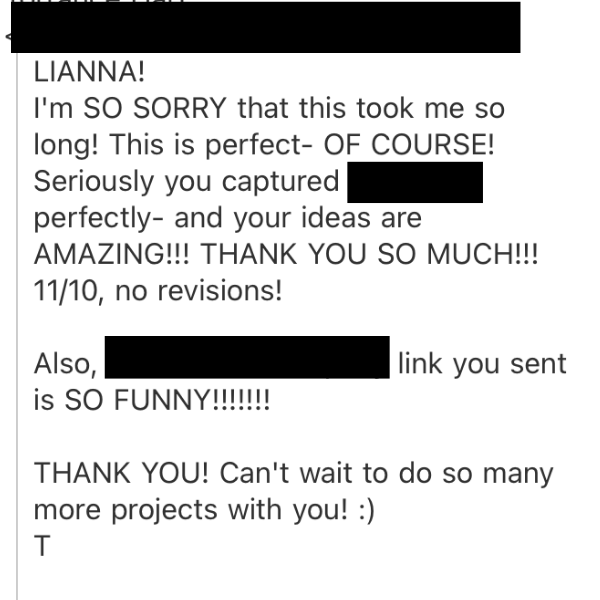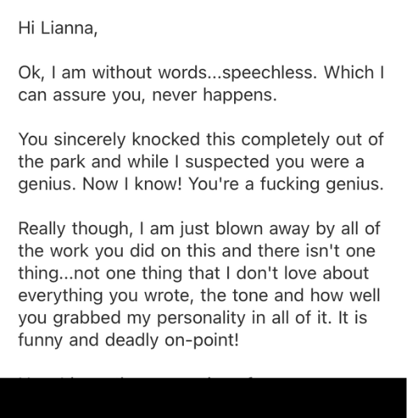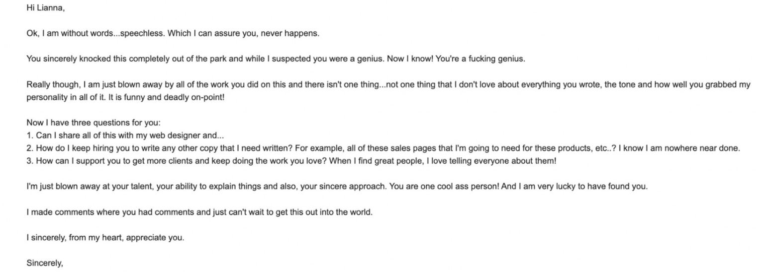 There’s copy and then there’s Lianna’s copy. Because of her incredible brain we’ve amplified our brand’s personality, converted customers into raving fans, and actually enjoy creating copy. If you want to convert more customers and feel really good about your brand, hire Lianna.