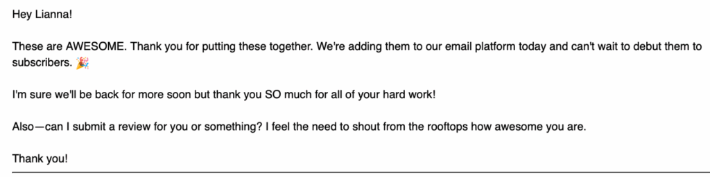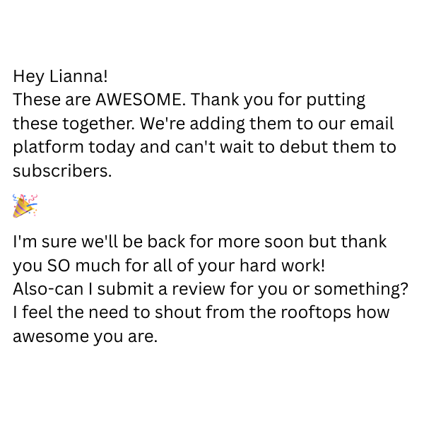 Lianna is an absolute gem. I regret not having hired her much sooner to help us with our landing page, newsletter format, and primary lead magnet nurture automation. Her process is top notch, very communicative, clear, did what she said she was going to do when she said she would do it, and included a few really nice touches, which made the engagement feel like an experience, not just a boring transaction. Stop wondering if you should hire her, you should’ve already done it.